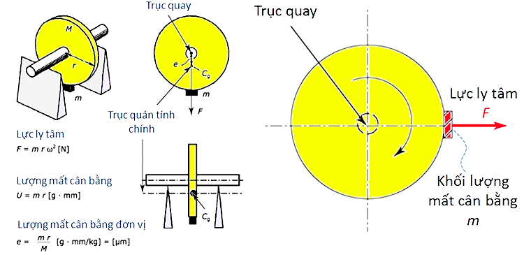 Đầu tiên, cần tính toán lực ly tâm F(N) được sinh ra từ chuyển động của khối lượng vật mất cân bằng m, đĩa quay ở tốc độ w.