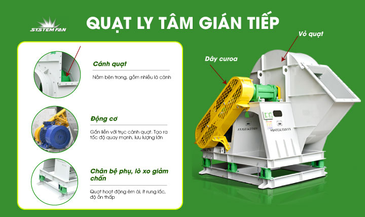 Đối với dòng quạt gián tiếp, thường có cấu tạo truyền động qua dây curoa và khớp nối cứng. Với cơ chế này giúp tách biệt động cơ ra khỏi vị trí cánh quạt. Tránh cho động cơ tiếp xúc trực tiếp với dòng khí, bảo vệ động cơ hoạt động ổn định trong môi trường khắc nghiệt, môi trường axit, nhiệt độ cao.