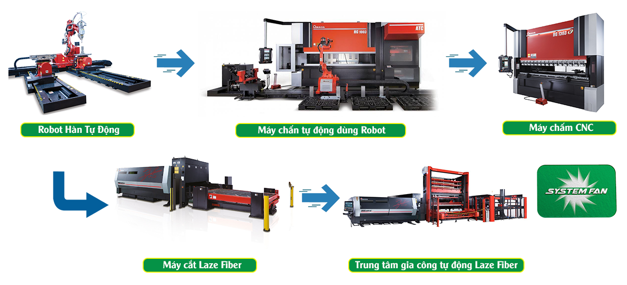 Sản phẩm của System Fan được gia công và sản xuất trên các máy móc hiện đại, tân tiến nhất. Các loại máy chấn CNC, máy cắt Laser, máy Fiber... được nhập khẩu từ người ngoài. Đảm bảo tuyệt đối chất lượng sản phẩm. Với hệ thống hút bụi bằng Cyclone, đem đến giải pháp hút lọc bụi lên đến 99,98%.