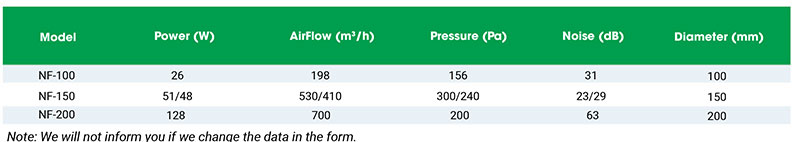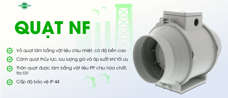 Với thiết kế nhỏ gọn, quạt NF được sử dụng lắp đặt nối ống, phục vụ cho việc thông gió, hút khí, cấp khí và làm mát cho các không gian vừa và nhỏ như các tòa nhà, văn phòng, trung tâm thương mại… Với độ ồn thấp, không ảnh hưởng tới không gian lắp đặt.
