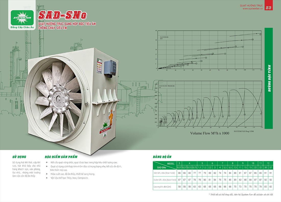 Quạt hướng trục dạng hộp truyền động trực tiếp SAD-SNo là loại quạt hướng trục trực tiếp, có motor gắn liền với cánh quạt tạo áp suất và lưu lượng gió đạt chuẩn theo model. Quạt được ứng dụng rộng rãi để hút khí thải, cấp khí tươi, hút khói cho bếp nhà hàng, khách sạn, văn phòng, tòa nhà và những môi trường cần độ ồn thấp.