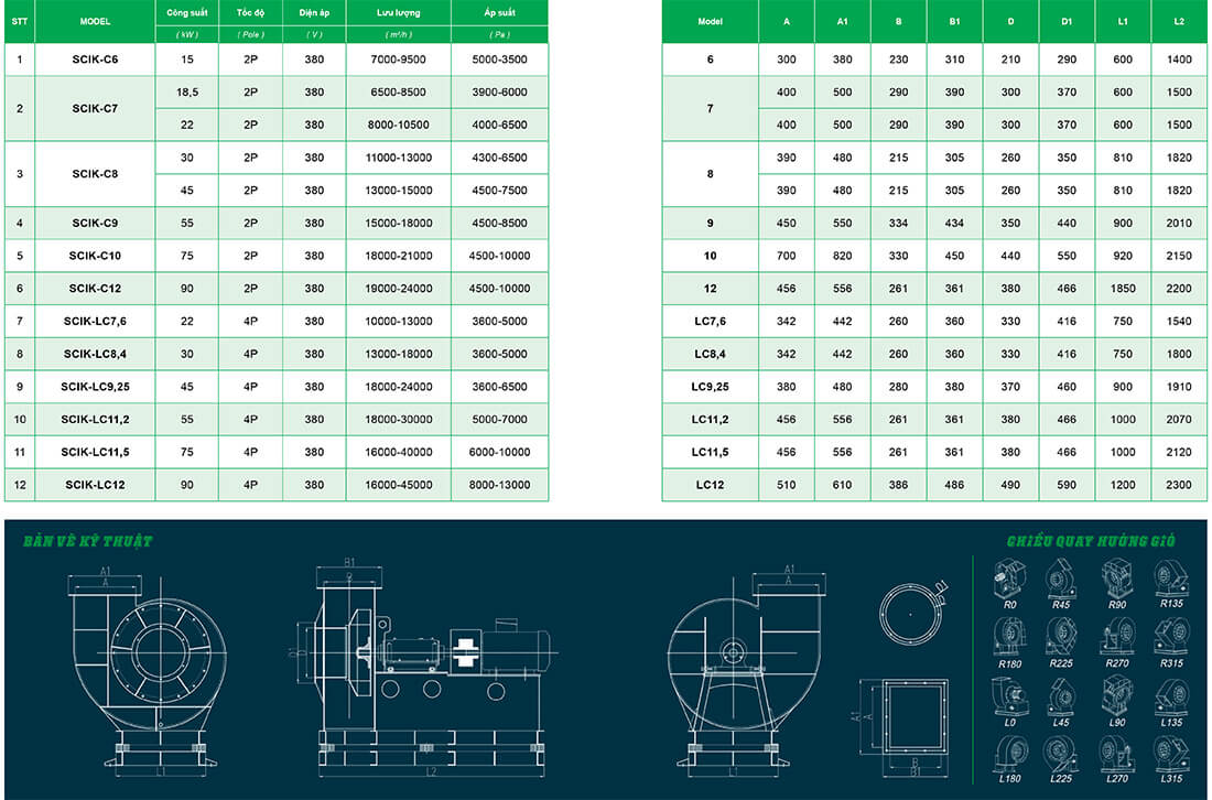 ✔ Cánh quạt ly tâm SCIK-CNo được truyền động gián tiếp thông qua gối đỡ và dây curoa nhằm tách động cơ ra khỏi môi trường làm việc có khói bụi nhiệt độ cao, hơi ẩm nhiều.