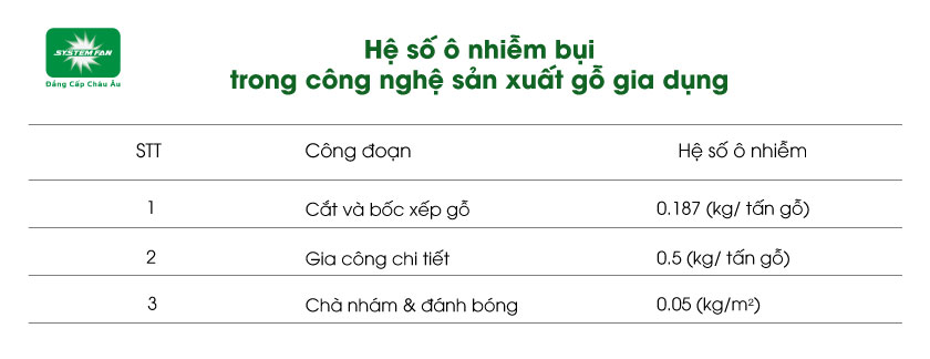 Dưới đây là hệ số ô nhiễm bụi trong công nghệ sản xuất gỗ gia dụng (Theo thống kê của WHO, năm 1993)