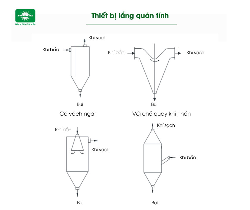 Thiết bị lắng quán tính dựa vào sự thay đổi đột ngột sự chuyển hướng chuyển động của dòng khí. Các hạt bụi chịu tác dụng của lực quán tính tiếp tục chuyển động theo hướng ban đầu và tách ra khỏi dòng khí. Hiệu suất của thiết bị này có thể đạt từ 65 - 80% với các hạt bụi có kích thước từ 25 - 30um.
