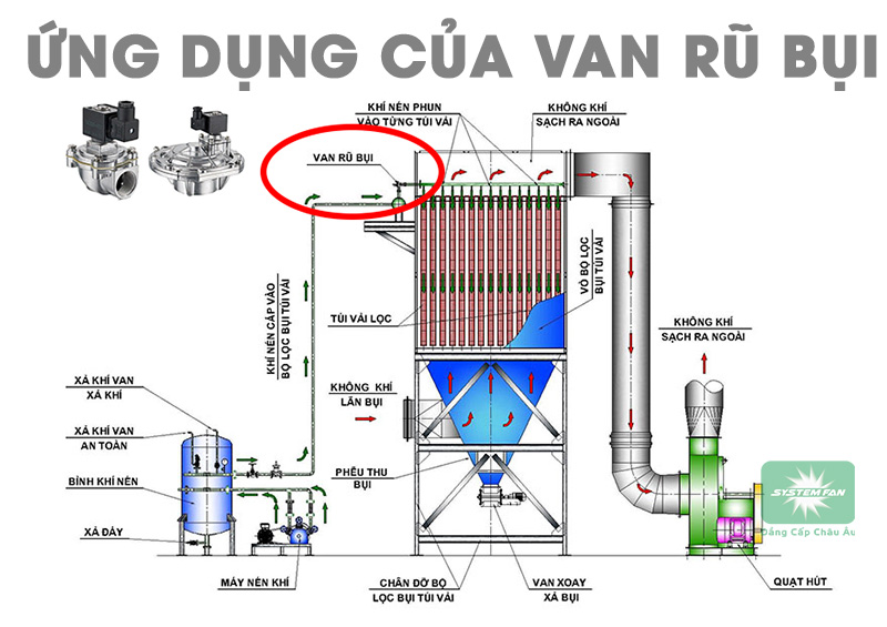 Trong các hệ thống này thì van rũ bụi đóng vai trò hết sức quan trọng, nó giúp loại bỏ bụi đã được thu vào để xả vào đúng vị trí. Bộ lọc bụi của cá hệ thống sẽ bắt bụi và tích tụ lâu ngày. Bụi bẩn có thể bám vào thành một lớp dày và làm tắc bộ lọc của hệ thống. Lâu ngày sẽ giảm đi hiệu quả của hệ thống. Như vậy, nhờ việc sử dụng van rũ bụi giúp tạo ra luồng khí nén phát ra sóng xung kích đi qua bộ lọc, phá vỡ các mảng bụi bẩn bám dính trên bộ lọc. Bụi sẽ rơi xuống phễu và thu gom ra ngoài.